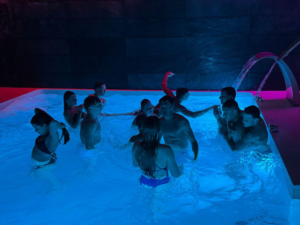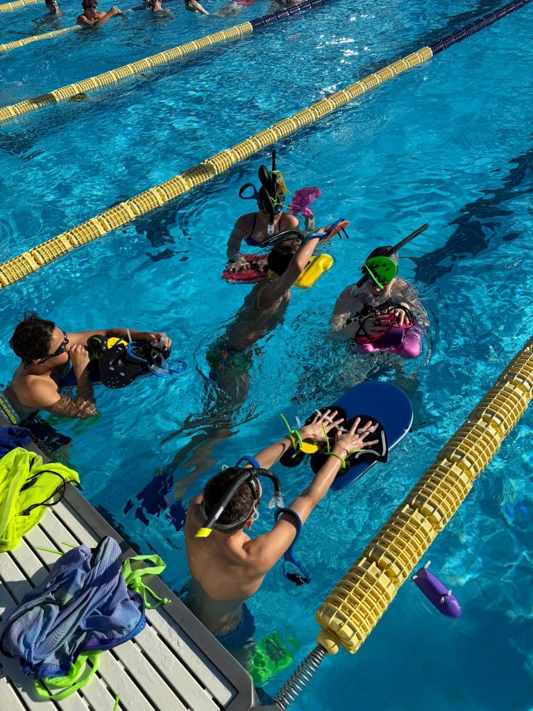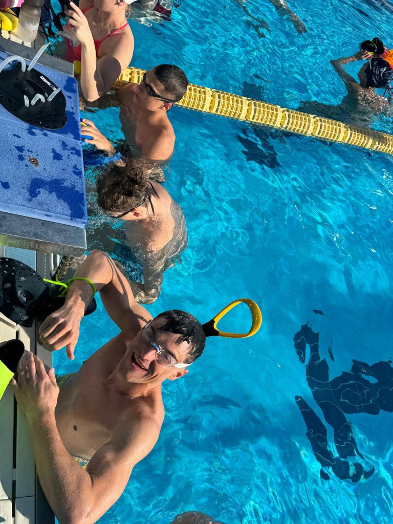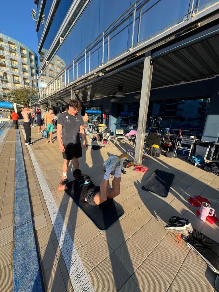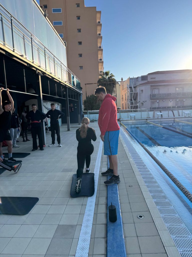 Nach dem Frühstück ging es direkt weiter zur Athletik. Oben angekommen wurden fleißig Übungen gemacht, bevor es dann ohne große Pause ins Wasser ging. Dort stand ein altbekannter Programmpunkt an: der Test, den wir schon zu Beginn des Trainingslagers geschwommen sind. Damals schon anstrengend – diesmal nicht weniger. Trotzdem haben sich alle durchgebissen, auch wenn man dem ein oder anderen angesehen hat, dass die Arme langsam schwer wurden.