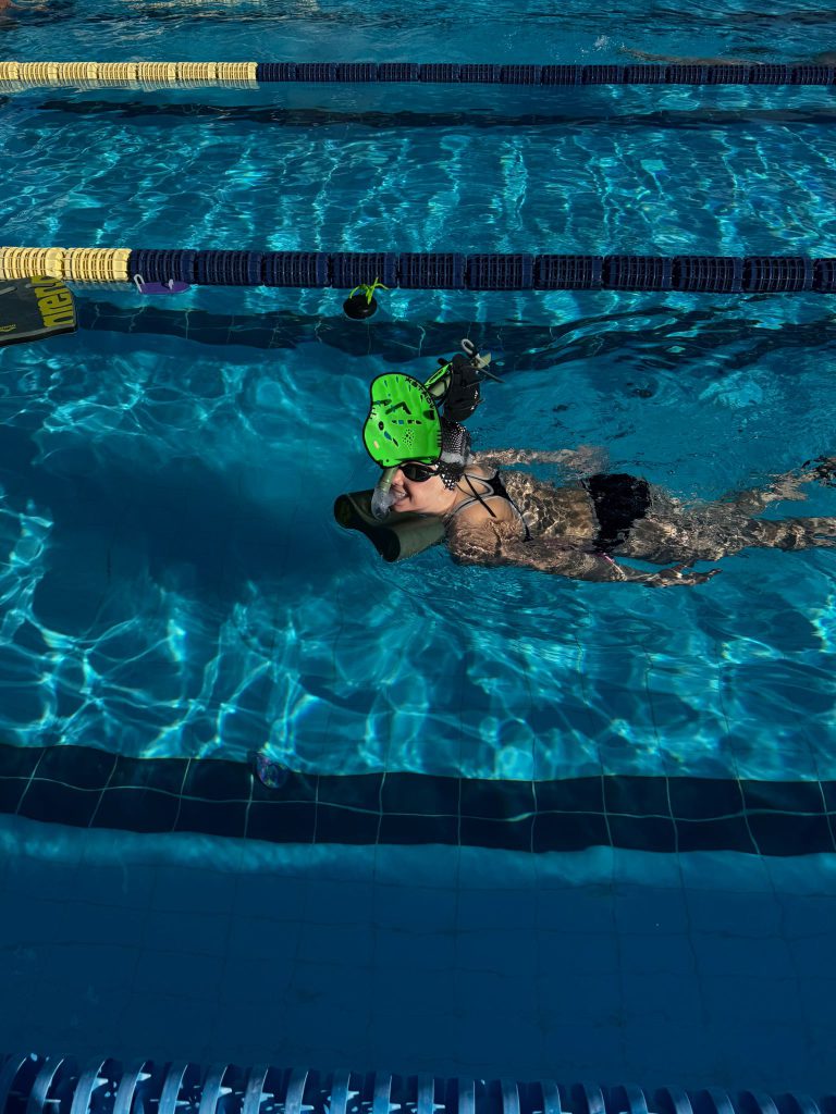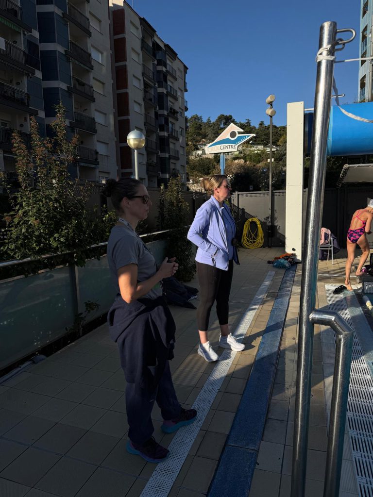 Um 8:15 Uhr haben wir uns getroffen und sind zusammen zum Becken gelaufen. Von 9 bis 11 Uhr hatten wir unser erstes Wassertraining. Das war noch ziemlich entspannt.