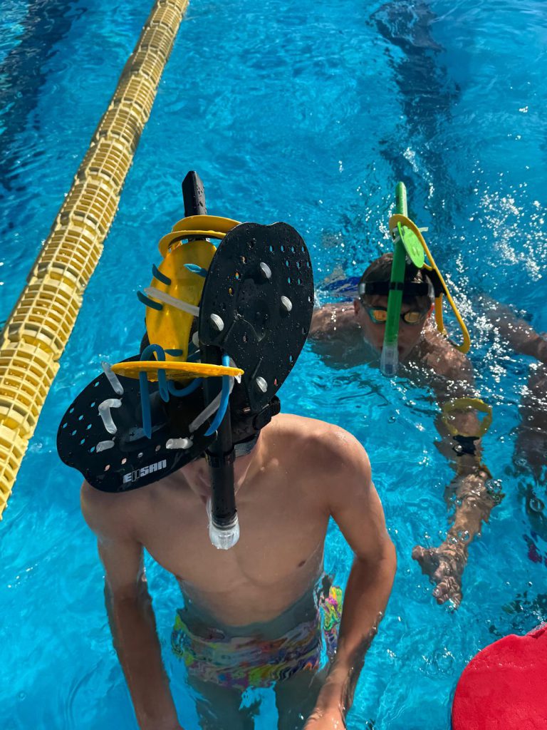 Und nein, bei der Materialschlacht werfen wir uns nicht gegenseitig mit unseren Brettern ab, sondern es geht darum möglichst viel von unseren Trainingsmaterialien für 200m zu nutzen, knifflig daran ist allerdings, dass nichts so benutzt werden darf wie es eigentlich richtig ist. So sind der Kreativität keine Grenzen gesetzt. Ob Paddels am Fuß, Flossen an der Hand, Fingerpaddels am Schnorchel, ganz egal alles ist erlaubt und umso verrückter, desto lustiger.